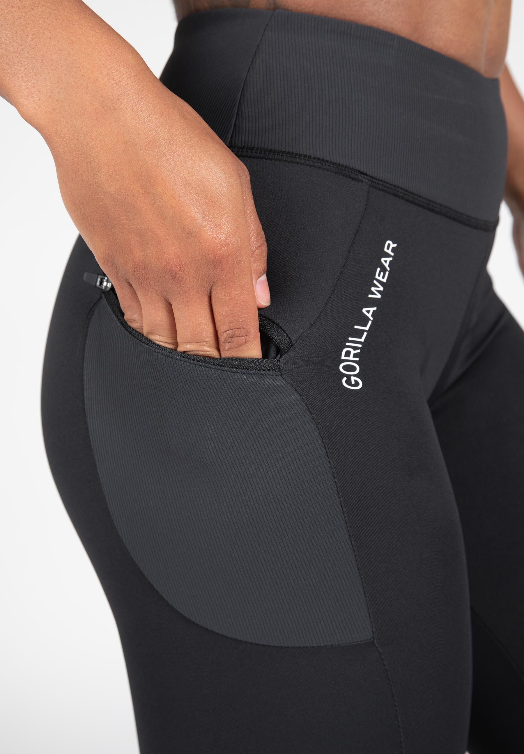 Leggingsen är tillverkade i ett ventilerande material med meshpartier som förbättrar andningsförmågan under intensiva övningar. Den höga ribbade midjan ger både stöd och en smickrande passform som håller leggingsen på plats under hela träningspasset. För extra bekvämlighet finns även en smart ficka med dragkedja för förvaring av dina småsaker.